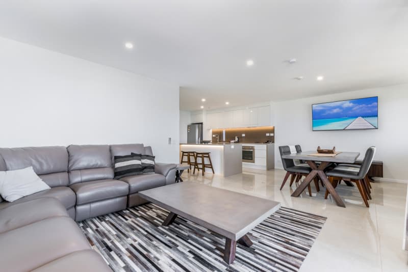 Room features an ensuited master bedroom with a queen bed, second bedroom with two single beds and third bedroom with TiMOTION king size bed.